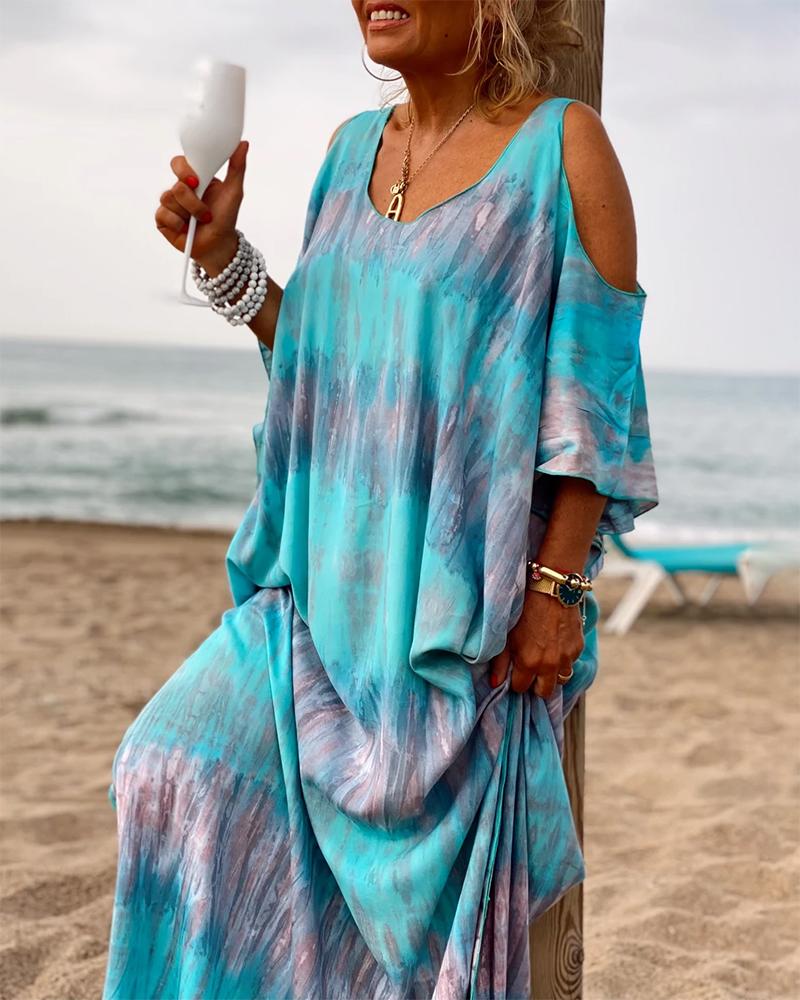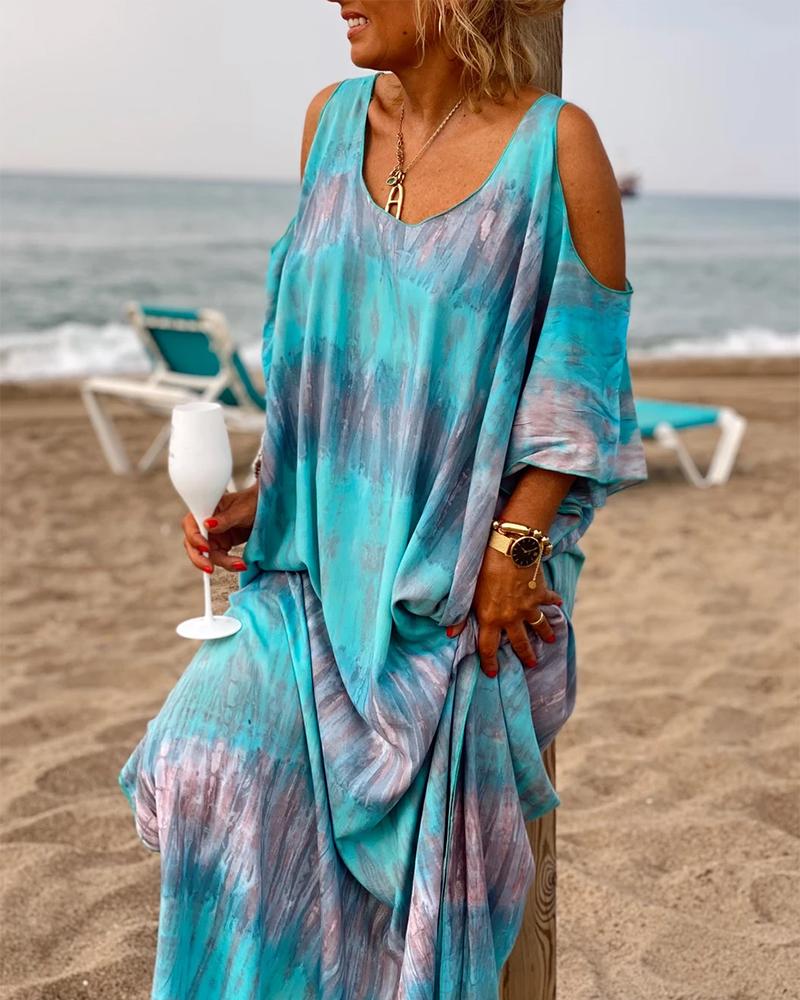 【Ship in 24 hours】Tie-Dye Print Cold Shoulder Batwing Sleeve Maxi Dress